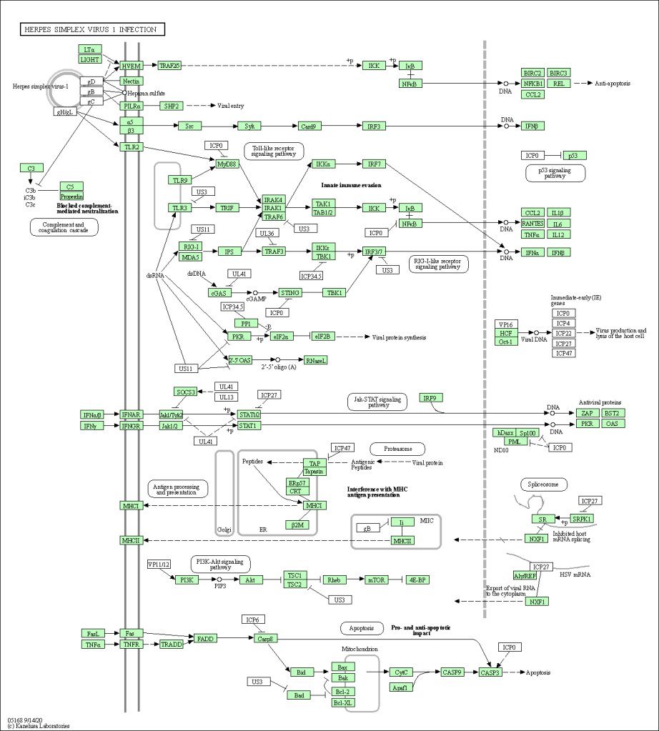 Annotated KEGG pathway showing hit genes overlaid (green).