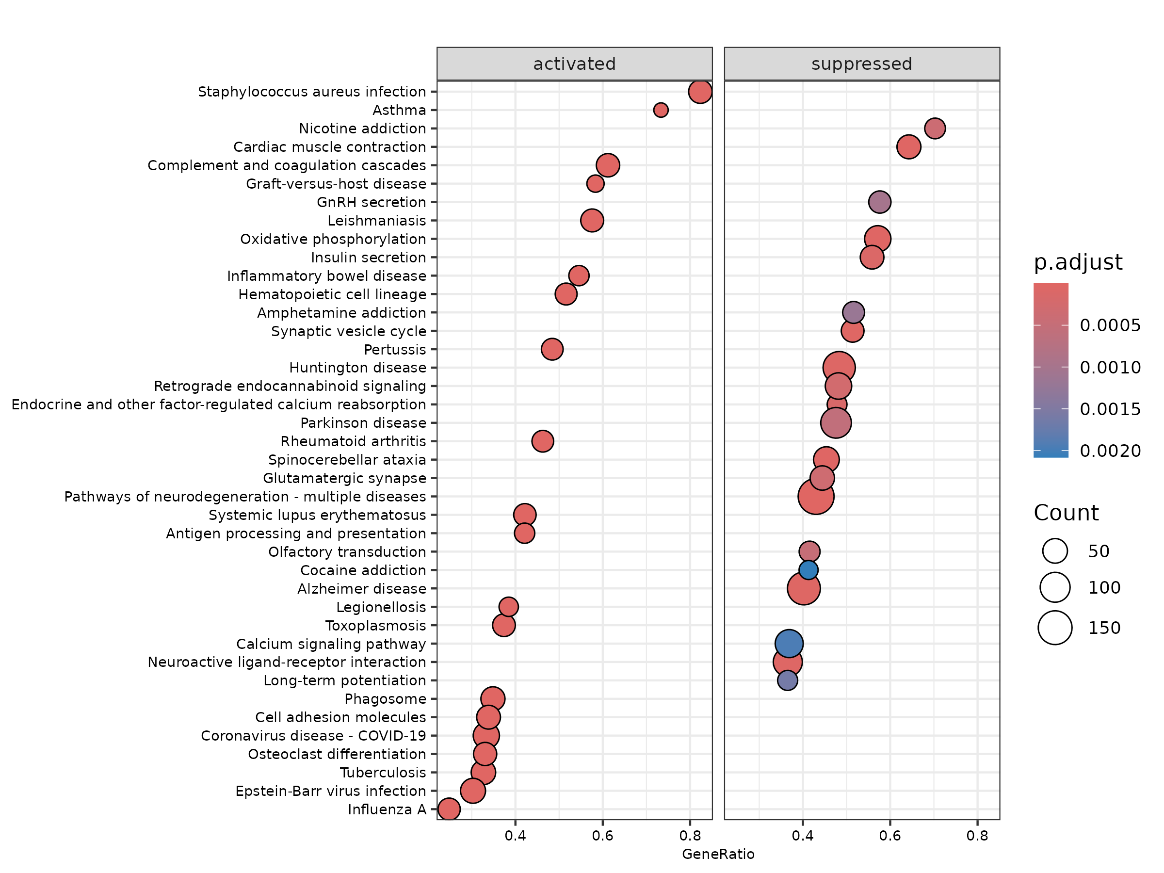 Highlights pathways that are activated or suppressed, along with gene ratios and p-adjusted values.