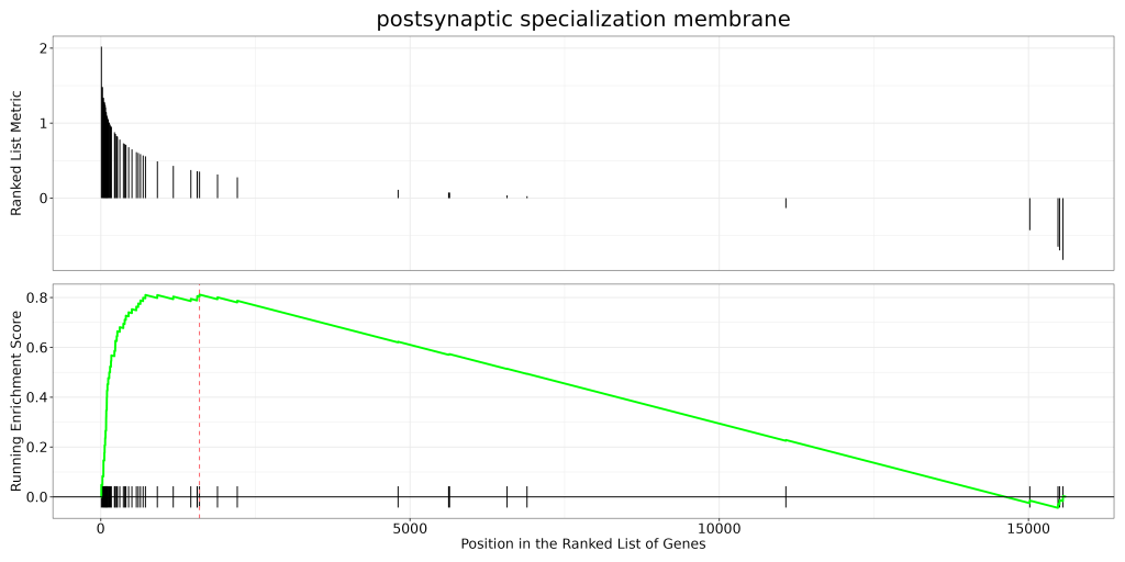 Shows the enrichment score of a specific pathway (e.g., postsynaptic specialization) across a ranked gene list.