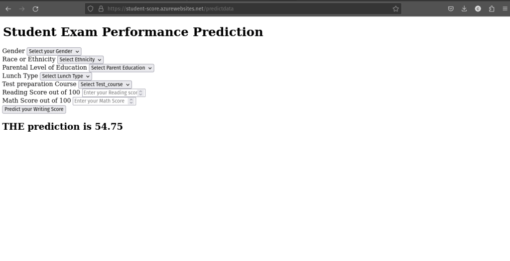 - Built a front-end form with inputs for features like gender, education level, scores, etc.